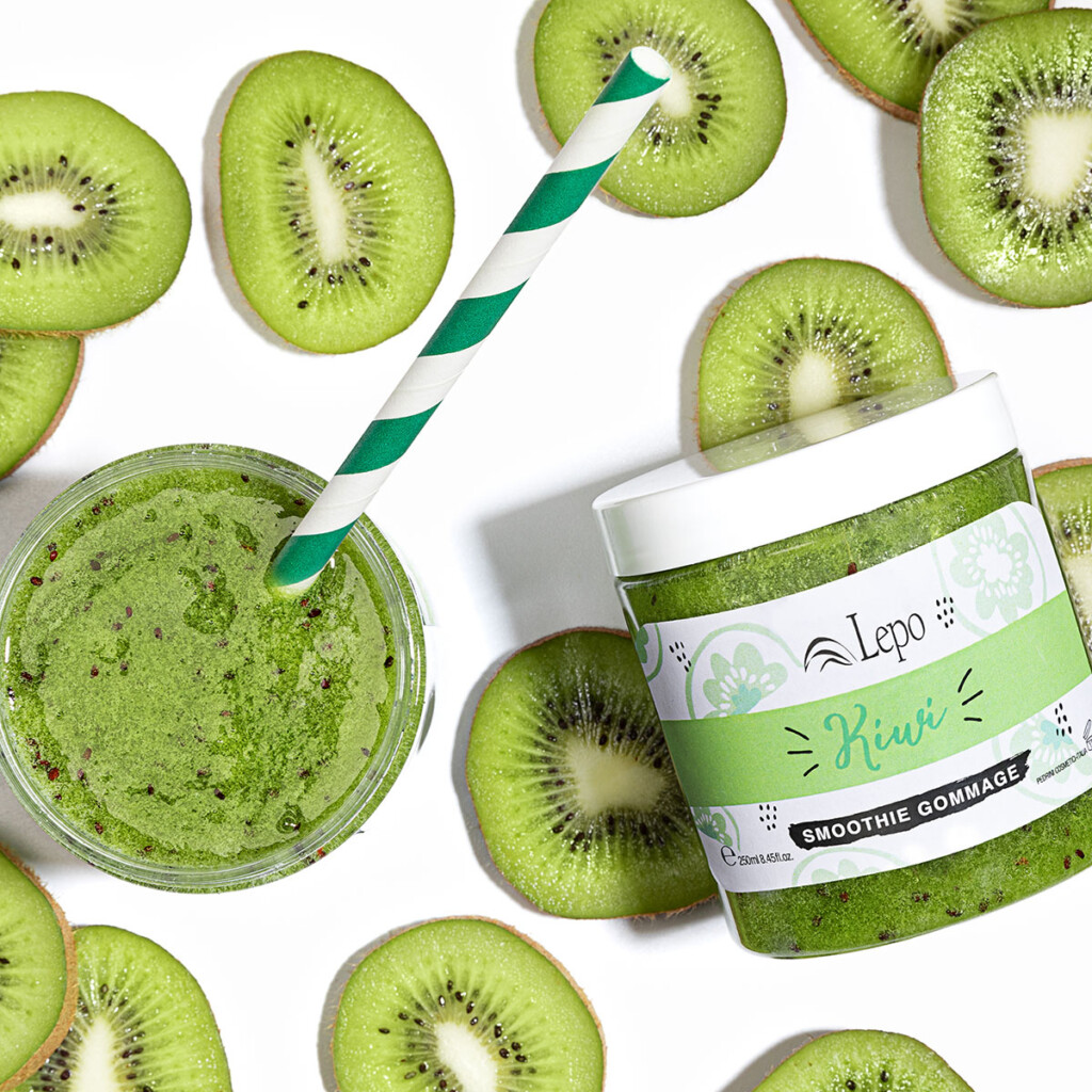 Με σπόρους ακτινιδίου, μαύρη ζάχαρη, κρυστάλλους θαλασσινού αλατιού και φυτική γλυκερίνη.
